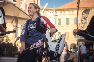 Bex with her national champion jersey in Finale Ligure EWS Sept 2018. Photo Credit: Dave Trumpore