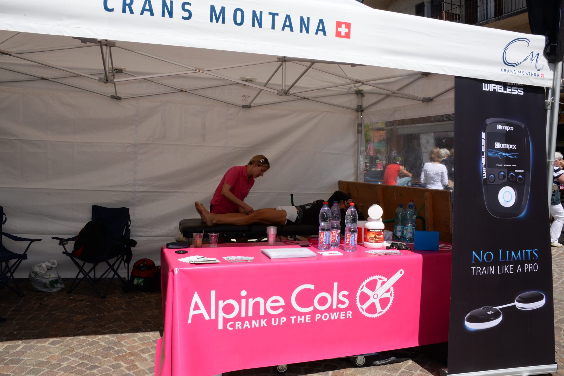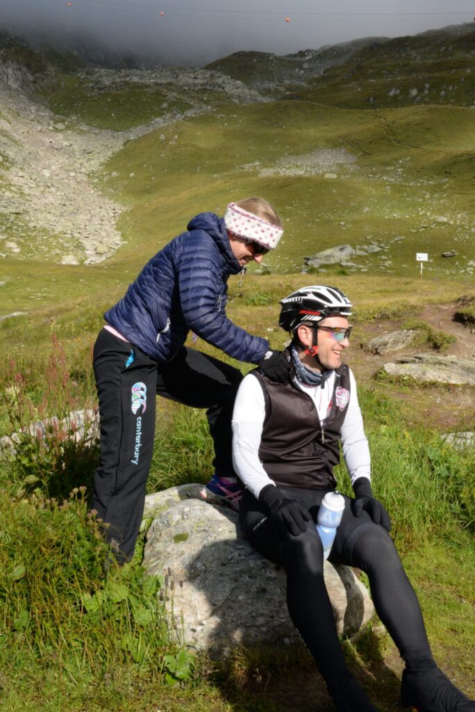 I was assigned the Dolomites and Swiss Alps leg from Venice to Geneva which included the famous Stelvio Pass. The race offered amateur riders the opportunity to ‘ride like a pro’ for 800 km, up (and down) 20,000m of 20 legendary cols. Was it it any wonder these guys (and girls) were going to need physio? I was no stranger to events like this, in fact this is how Rich and I met back in 2010 whilst both working on the Dallaglio Cycle Slam so I was prepared for a week of hard work. I wasn’t however prepared for the worst week of weather the Alps has seen in many years. The week started in a bright sunshine but quickly deteriorated into pouring rain and almost zero degrees at the summits of some of the cols. This made for demanding riding conditions for the riders and great fun trying to set up a treatment area protected from the elements! Having physiotherapy on hand for the riders ensured those with existing medical conditions could keep any niggles at bay and those feeling tired could enjoy a massage to make sure they were fit to ride the next days stage. When I wasn’t mobilising, massaging or manipulating I was busy putting up tents, taking down tents, handing out energy bars, making energy drinks and cheering. The week finished in Geneva having passed through some of the most beautiful scenery in Italy and Switzerland and I was able to return home with my toblerone happy but exhausted……..